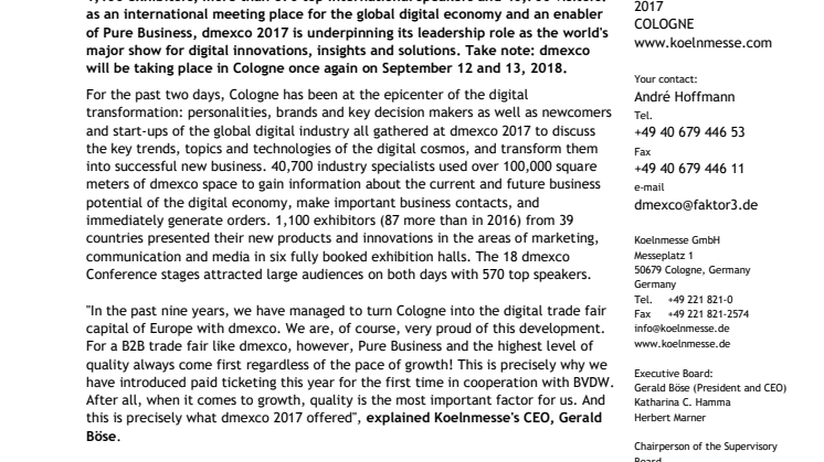 "In the past nine years, we have managed to turn Cologne into the digital trade fair capital of Europe with dmexco. We are, of course, very proud of this development. For a B2B trade fair like dmexco, however, Pure Business and the highest level of quality always come first regardless of the pace of growth! This is precisely why we have introduced paid ticketing this year for the first time in cooperation with BVDW. After all, when it comes to growth, quality is the most important factor for us. And this is precisely what dmexco 2017 offered", explained Koelnmesse's CEO, Gerald Böse.