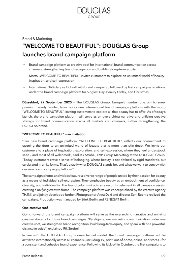 Düsseldorf, 29 September 2025 – The DOUGLAS Group, Europe’s number one omnichannel premium beauty retailer, launches its new international brand campaign platform with the motto “WELCOME TO BEAUTIFUL”, inviting customers to explore all that beauty has to offer. As of today’s launch, the brand campaign platform will serve as an overarching narrative and unifying creative strategy for brand communication across all markets and channels, further strengthening the DOUGLAS brand.