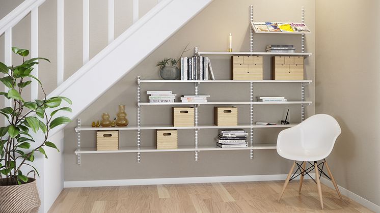 There is often valuable space to be recovered in tricky spaces. Using wallbands in different heights and shelves of different widths, you can use the space to the maximum. The shelving system is easy to customize to fit most wall surfaces. Why not turn the wall under your staircase into a bookshelf, working space or storage?