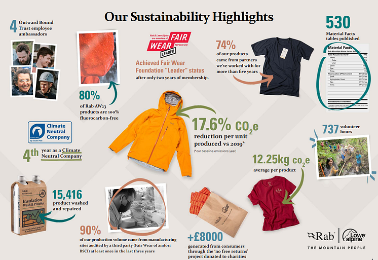 Equip Outdoor Technologies UK Ltd. ("Equip”), home of technical outdoor apparel and equipment brands Rab and Lowe Alpine, have released their 2023 Sustainability Report at the OutDoor by ISPO trade show in Munich. Equip has continued to build on its commitment to reduce environmental impact with a 17.6% GHG reduction per product since 2019. The company continues to engage partners, from athletes to suppliers, underpinned by its Mountain Manifesto mindset, to encourage collaboration to create change and stand for honest and transparent CSR communications.