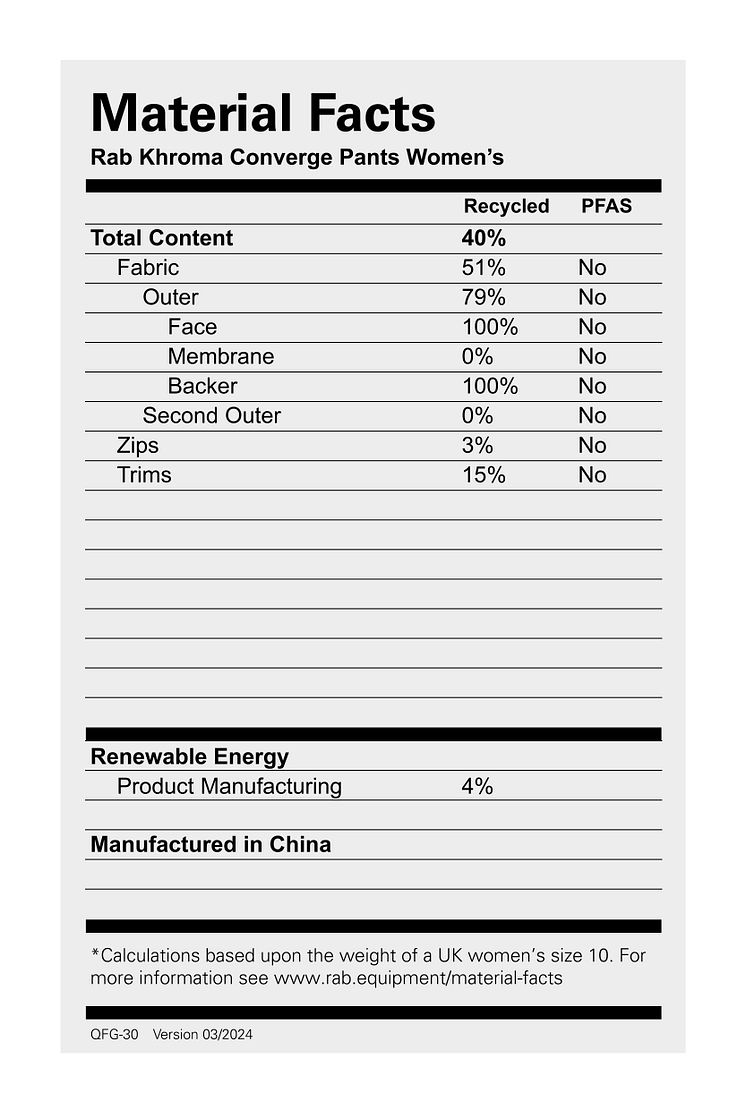 Through Rab’s Material Facts, an industry-first launched to consumers in AW23, consumers can easily identify the PFAS status of each product component, either in the fabric, down, zips or trims. This allows more informed decisions around purchasing choices.