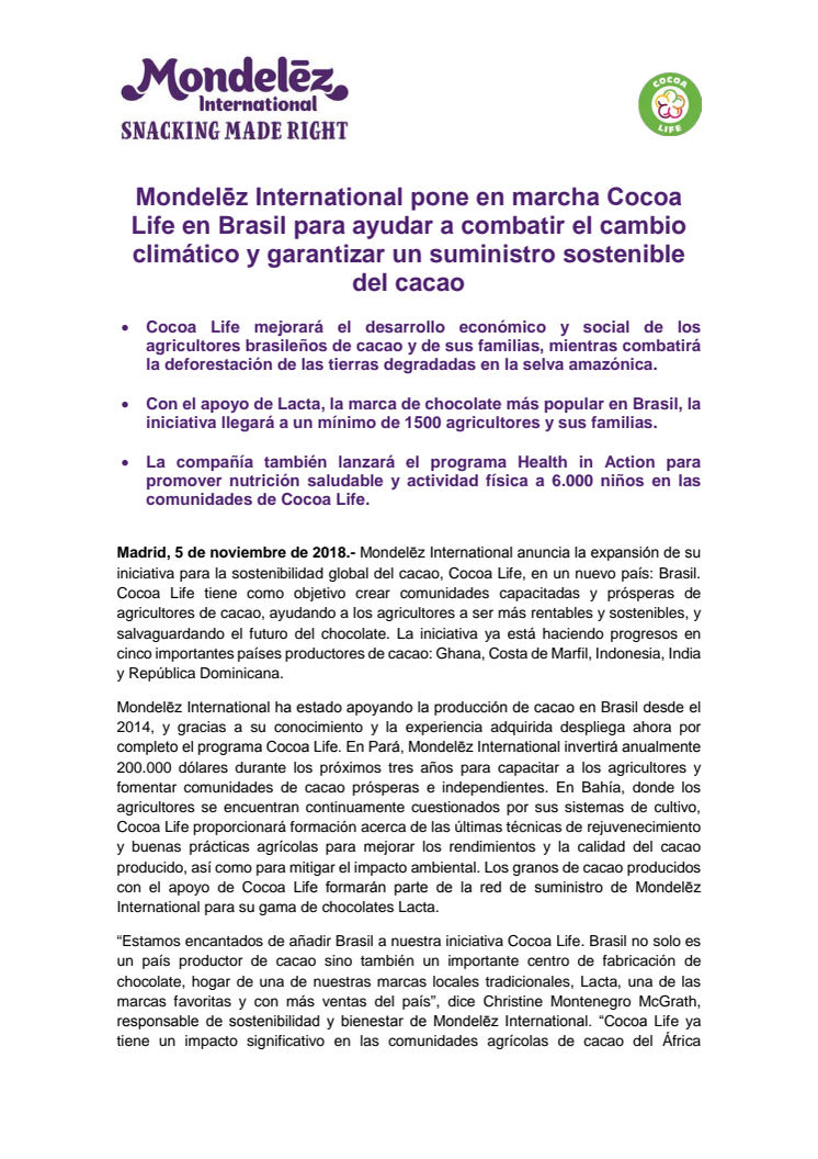 Mondelēz International anuncia la expansión de su iniciativa para la sostenibilidad global del cacao, Cocoa Life, en un nuevo país: Brasil. Cocoa Life tiene como objetivo crear comunidades capacitadas y prósperas de agricultores de cacao, ayudando a los agricultores a ser más rentables y sostenibles, y salvaguardando el futuro del chocolate.