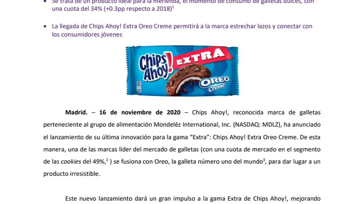 Madrid. – 16 de noviembre de 2020 – Chips Ahoy!, reconocida marca de galletas perteneciente al grupo de alimentación Mondelēz International, Inc. (NASDAQ: MDLZ), ha anunciado el lanzamiento de su última innovación para la gama “Extra”: Chips Ahoy! Extra Oreo Creme. De esta manera, una de las marcas líder del mercado de galletas (con una cuota de mercado en el segmento de las cookies del 49%*) se fusiona con Oreo, la galleta número uno del mundo*, para dar lugar a un producto irresistible.