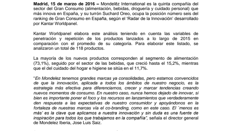 Mondelēz International es la quinta compañía del sector del Gran Consumo (alimentación, bebidas, droguería y cuidado personal) que más innova en España, y su turrón Suchard Oreo, ocupa la posición número seis del ranking de Gran Consumo en España, según el ‘Radar de la Innovación’ desarrollado por Kantar Worldpanel.