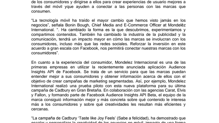 “La tecnología móvil ha traído el mayor cambio que hemos visto jamás en los negocios”, señala Bonin Bough, Chief Media and E-Commerce Officer at Mondelēz International. “. Ha cambiado la forma es la que descubrimos, experimentamos y compartimos contenidos. También ha cambiado la industria de la publicidad y la comunicación, tendrá un impacto mayor en cómo las marcas se involucran con los consumidores, incluso más que las redes sociales. Reforzar la inversión en este acuerdo a gran escala con Facebook, nos permitirá conectar nuestras marcas con los consumidores”.