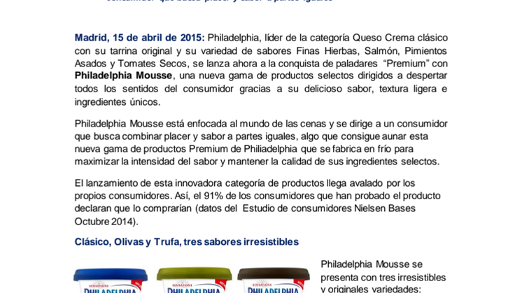 Madrid, 15 de abril de 2015: Philadelphia, líder de la categoría Queso Crema clásico con su tarrina original y su variedad de sabores Finas Hierbas, Salmón, Pimientos Asados y Tomates Secos, se lanza ahora a la conquista de paladares “Premium” con Philadelphia Mousse, una nueva gama de productos selectos dirigidos a despertar todos los sentidos del consumidor gracias a su delicioso sabor, textura ligera e ingredientes únicos.