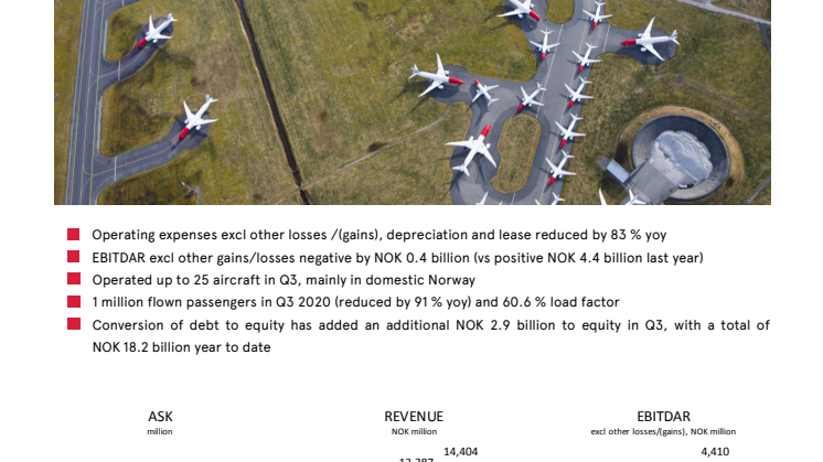La demanda se vio gravemente afectada por los cambios en las restricciones de viaje y una ola secundaria de infecciones de COVID-19 reportadas en los mercados clave, lo que llevó a una demanda fluctuante y decreciente. Aproximadamente 25 aviones de corto radio estuvieron operativos durante el tercer trimestre, de una flota total actual de 140. Desde que golpeó la pandemia, se ha llevado a cabo un importante proceso de reestructuración financiera, alcanzando varios hitos nuevos durante el tercer trimestre de 2020. La conversión adicional de deuda de arrendadores y de proveedores en capital tuvo un efecto positivo combinado de 2.900 millones de coronas (270,77 millones de euros) durante el trimestre. En lo que va del año, la reestructuración ha mejorado el patrimonio neto en 18.200 millones de coronas (1.699,33 millones de euros).