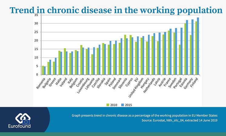This graph shows the trend in chronic disease in the working population across the EU. Romania has the lowest share of the working population reporting a chronic disease (5% in 2015), while Finland has the highest share (34%).