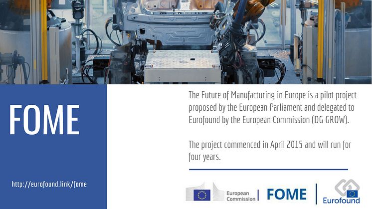 Competitiveness, research and development and a nation’s capacity for innovation all hinge on the performance of the manufacturing sector. The pilot project on the Future of Manufacturing in Europe (FOME) was launched in 2015 to explore the prospects for a globally competitive future in manufacturing and the associated implications for employment in terms of the number of jobs, workforce composition, skill needs and geographical dispersion throughout Europe. The project will run until 2019.