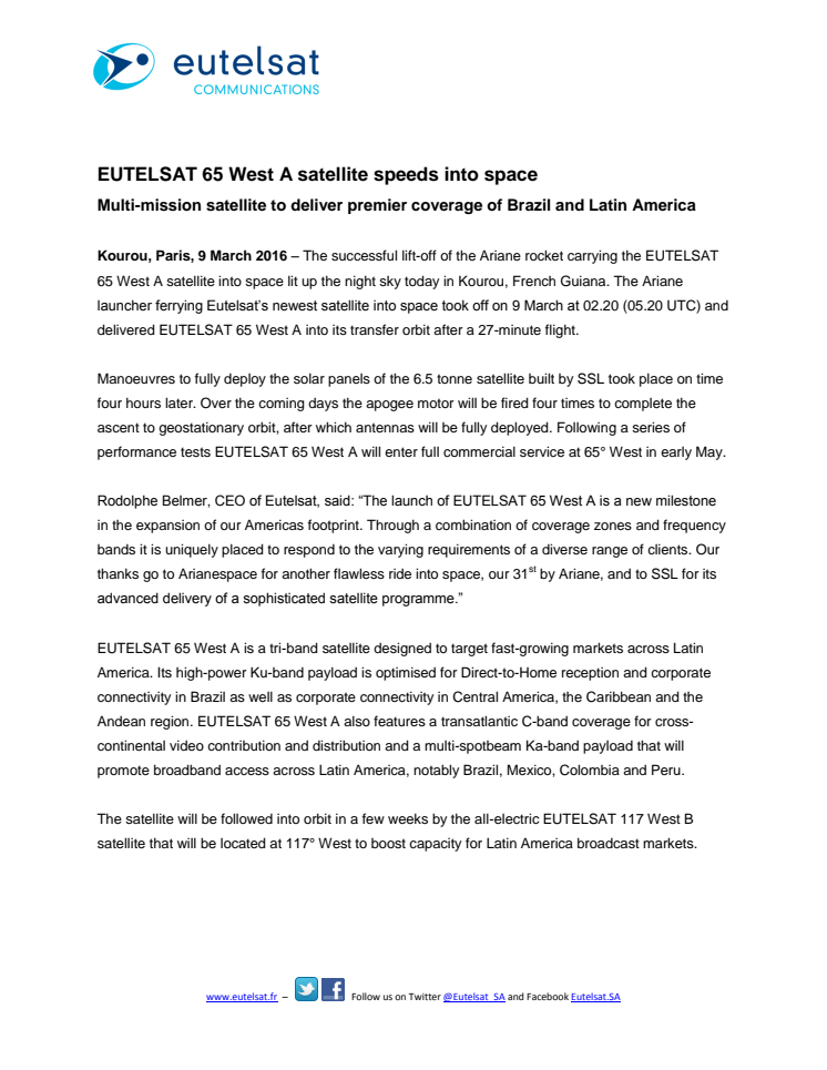 EUTELSAT 65 West A satellite speeds into space