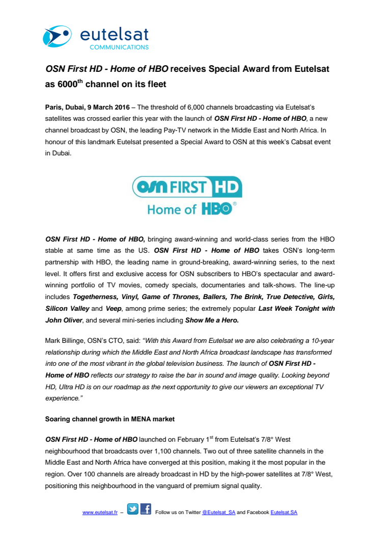 The threshold of 6,000 channels broadcasting via Eutelsat’s satellites was crossed earlier this year with the launch of OSN First HD - Home of HBO, a new channel broadcast by OSN, the leading Pay-TV network in the Middle East and North Africa. In honour of this landmark Eutelsat presented a Special Award to OSN at this week’s Cabsat event in Dubai.