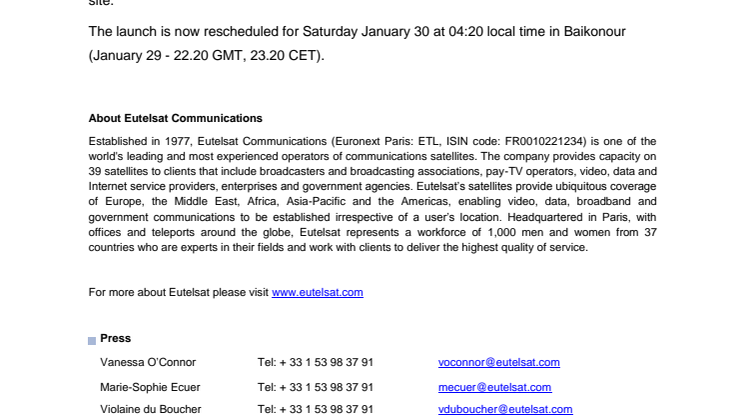 The launch is now rescheduled for Saturday January 30 at 04:20 local time in Baikonour (January 29 - 22.20 GMT, 23.20 CET).