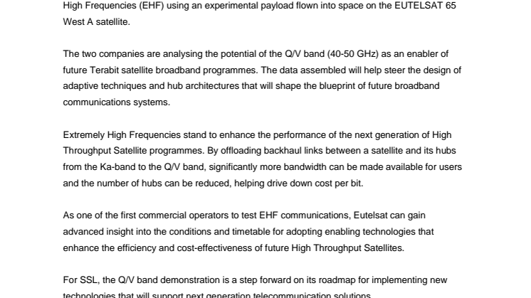 Eutelsat and Space Systems Loral test potential of Extremely High Frequencies (EHF) on EUTELSAT 65 West A as a blueprint for future broadband systems