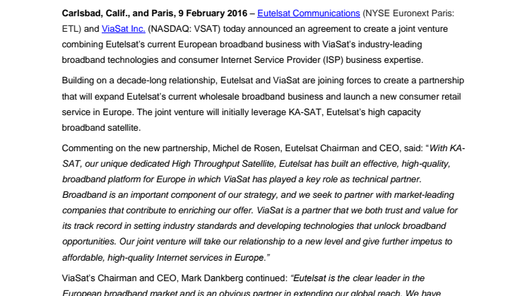 Carlsbad, Calif., and Paris, 9 February 2016 – Eutelsat Communications (NYSE Euronext Paris: ETL) and ViaSat Inc.(NASDAQ: VSAT) today announced an agreement to create a joint venture combining Eutelsat’s current European broadband business with ViaSat’s industry-leading broadband technologies and consumer Internet Service Provider (ISP) business expertise.
