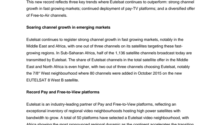 This new record reflects three key trends where Eutelsat continues to outperform: strong channel growth in fast growing markets; continued deployment of pay-TV platforms; and a diversified offer of Free-to-Air channels.