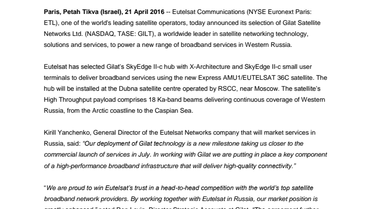 Paris, Petah Tikva (Israel), 21 April 2016 -- Eutelsat Communications (NYSE Euronext Paris: ETL), one of the world's leading satellite operators, today announced its selection of Gilat Satellite Networks Ltd. (NASDAQ, TASE: GILT), a worldwide leader in satellite networking technology, solutions and services, to power a new range of broadband services in Western Russia.