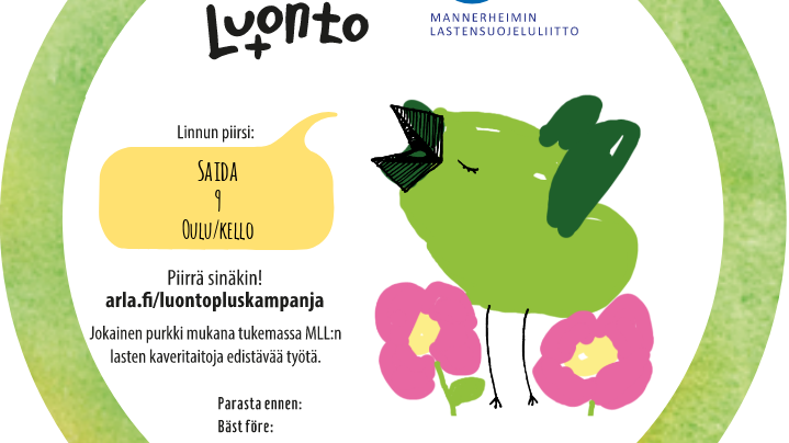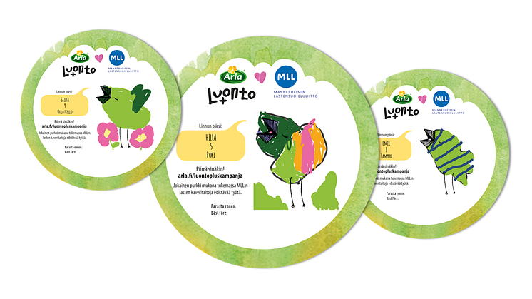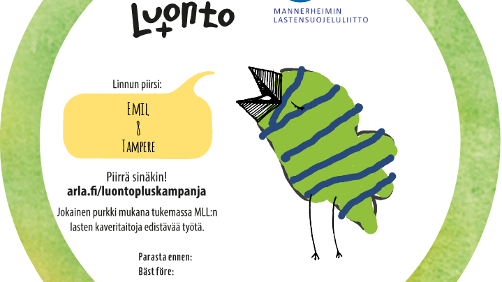 Arla Luonto+-jogurttien hyväntekeväisyyskampanjassa lapset ovat päästäneet luovuutensa valloilleen ja piirtäneet uusia lintukavereita. Nyt osa näistä riemukkaista tietokoneella tehdyistä piirroksista on painettu 175-grammaisten Arla Luonto+-jogurttikippojen kansiin. Jokainen lapsen piirtämällä linnulla varustettu jogurttikippo on mukana tukemassa MLL:n kaveritaitotyötä.