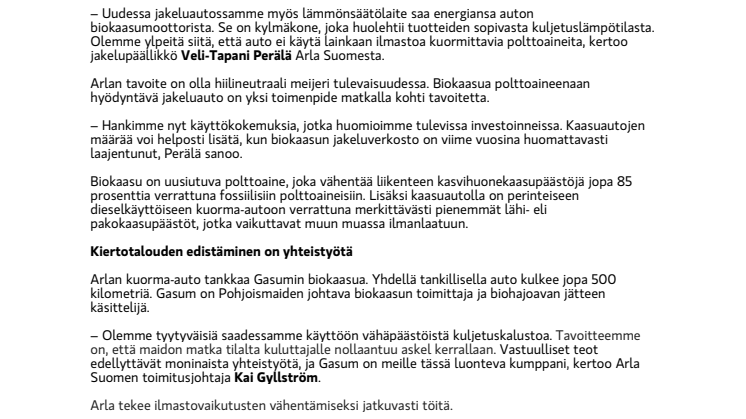 Arla Suomi on ottanut käyttöön tuotekuljetuksia varten biokaasulla kulkevan kuorma-auton. Biokaasu on täysin uusiutuvaa, ja sen käyttäminen polttoaineena on Arlan uusimpia tekoja matkalla kohti entistä vähäpäästöisempää maitoketjua.