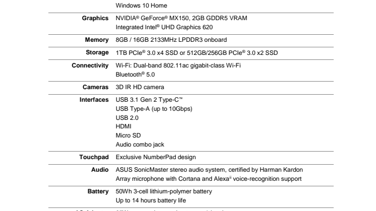 This fully redesigned series of premium thin and light laptops introduces the stunning new frameless NanoEdge display, which features ultraslim bezels on all four sides and an unrivaled up to 95% screen-to-body ratio for a near-borderless viewing experience. The NanoEdge display also allows a much more compact design, with the result that each of the new Zenbook models has the smallest footprint in its class . The 13-inch and 14-inch models also optionally include the exclusive new NumberPad, an innovative productivity enhancement that provides a full-size LED-illuminated numeric keypad built into the touchpad. All models feature a special 3D IR camera that allows fast face login using Windows Hello, even in low-light environments.The combination of performance and mobility is a defining feature of the Zenbook series, and the new models feature a full complement of high-performance components including the latest 8th Generation Intel® Core™ i7 quad-core CPU, up to NVIDIA® GeForce® GTX 1050 Max-Q graphics, 16GB RAM, ultrafast PCIe® SSDs and gigabit-class Wi-Fi. All models are torture-tested to military-grade (MIL-STD-810G) reliability standards, with demanding tests that include environmental extremes of altitude, temperature and humidity, in addition to extensive drop, shock and vibration testing.