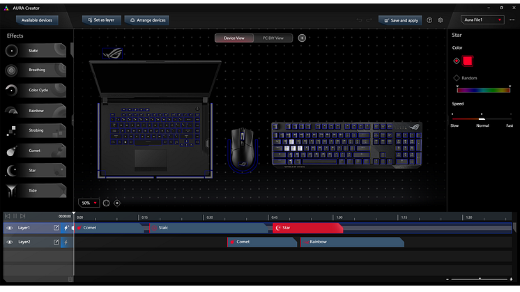 Debuting at Computex 2019, ASUS Aura Creator (beta) represents a step change in the evolution of personalized RGB illumination – enabling users of Aura Sync-compatible gear to create peerless LED lightshows. This brand-new effect-editing software has been developed by ROG software engineers to provide users with complete creative control over the lighting across an entire battle station. The streamlined interface belies surprisingly expansive depth for customization, making it easy to learn for beginners and a powerful arsenal for experienced creators and modders