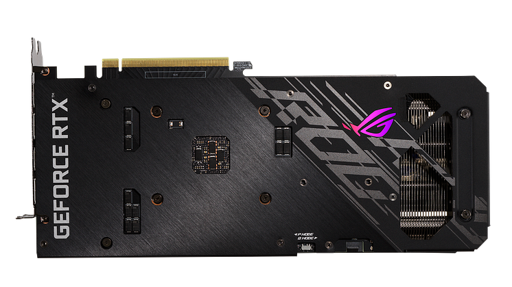 Flipping the card around reveals more design improvements. For enhanced heat dissipation, a wide backplate vent and shortened PCB allow hot air to escape towards chassis exhaust fans instead of being recycled back into the cooler. Stainless steel is used for the I/O bracket to protect ports and provide a more secure mount. To top it off, an ROG logo with addressable RGB backlighting adds flair.