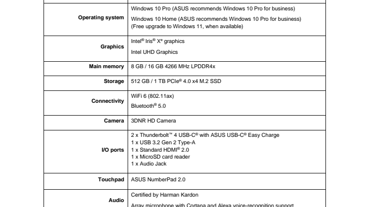 Powered by the latest 11th Generation Intel Core processors, up to 16GB RAM and Intel Iris Xe graphics, Zenbook 14X OLED gives all the all-round performance needed for smooth multitasking and effortless productivity. With up to the latest ultrafast 1 TB PCIe 4.0 x4 M.2 SSD and gigabit-class Intel WiFi 6 (802.11ax) users won't be waiting for apps or websites to load, either.
