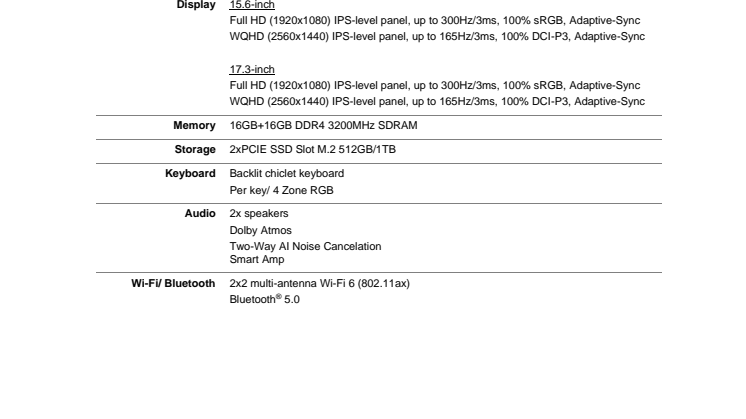 Display options offer a choice between a super-fluid Full HD panel with 300Hz refresh and 3ms response, or a super-sharp WQHD screen at 165Hz/3ms with a wider color gamut. Twin speakers provide rich sound, with up to 2.8x more volume and 3x more powerful bass than the last generation. And Two-Way AI Noise Canceling make team chats clearer while maintaining high FPS.