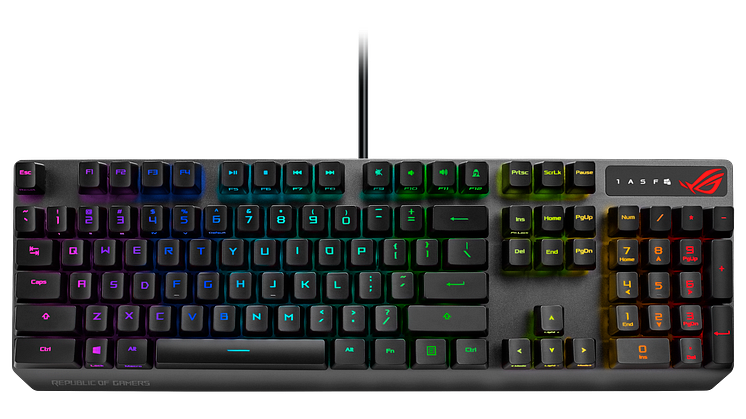 ROG Strix Scope RX provides an alloy top cover and IP56 water and dust resistance to further ensure durability and longevity. It comes ready for the action of first-person shooter (FPS) games with an extended Ctrl key for ‘Crouch,’ and other commands. A USB 2.0 port can be used as a passthrough for device charging and external storage. The Stealth key hides all apps and mutes audio for instant privacy, and the quick-toggle switch quickly changes between functions and media inputs. The keyboard also features a backlit ROG logo and customizable lighting effects. The Armoury Crate software utility allows users to customize user profiles, map keys, record macros and even track hardware stats during gameplay.
