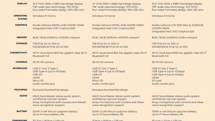 Huipputeho ja kompakti design ovat uuden Zenbook-malliston tukipilareita ja uusissa malleissa teho on viety äärimmilleen, sillä siinä on viimeisimmän 8. sukupolven Intel Core i7 neliytiminen –suoritin, jopa NVIDIA GeForce GTX 1050 Max-Q näytönohjain, 16 GB RAMia, ultranopeat PCIe SSDt ja Gigabitti-tasonWi-Fi.