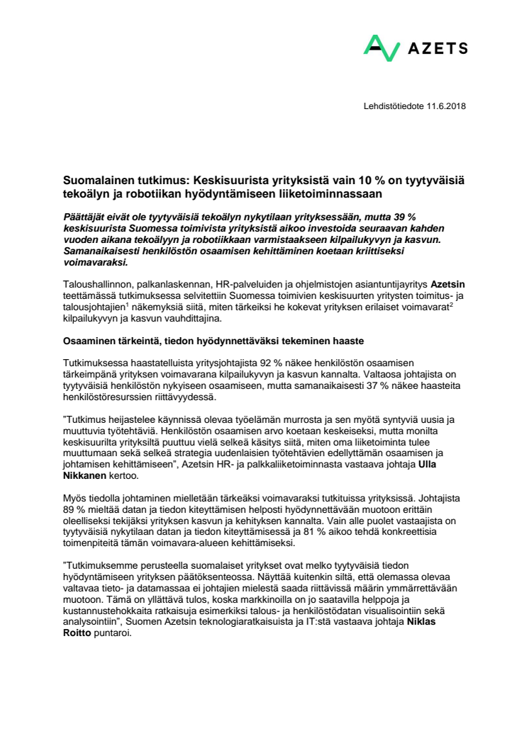 Päättäjät eivät ole tyytyväisiä tekoälyn nykytilaan yrityksessään, mutta 39 % keskisuurista Suomessa toimivista yrityksistä aikoo investoida seuraavan kahden vuoden aikana tekoälyyn ja robotiikkaan varmistaakseen kilpailukyvyn ja kasvun. Samanaikaisesti henkilöstön osaamisen kehittäminen koetaan kriittiseksi voimavaraksi.