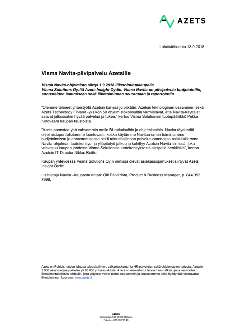 Visma Solutions Oy:ltä Azets Insight Oy:lle. Visma Navita on pilvipalvelu budjetointiin, ennusteiden laatimiseen sekä liiketoiminnan seurantaan ja raportointiin.