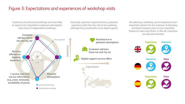 The next phase focuses on the service quality and personalized solutions for customers during their visit. When choosing an authorized OEM center, customers, particularly in the premium segment, expect to be attended to in a pleasant atmosphere and advised personally on their specific needs by a customer consultant. In UK and Spain, the service experience is being ranked as the most important criteria when choosing a service center, whereas in Germany the distance to the centers is the decisive factor.