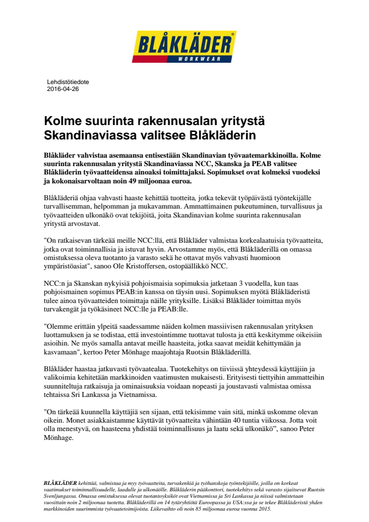 Blåkläder vahvistaa asemaansa entisestään Skandinavian työvaatemarkkinoilla. Kolme suurinta rakennusalan yritystä Skandinaviassa NCC, Skanska ja PEAB valitsee Blåkläderin työvaatteidensa ainoaksi toimittajaksi. Sopimukset ovat kolmeksi vuodeksi ja kokonaisarvoltaan noin 49 miljoonaa euroa.
