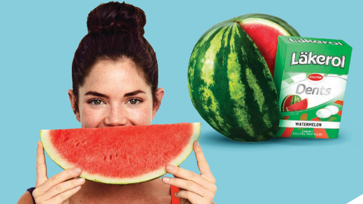 Läkerol Dents -ksylitolipastilleilla on vankka jalansija pastillimarkkinalla, sillä ne tyydyttävät makeanhiman samalla kun auttavat hampaiden hyvinvointiin. Vesimeloni on noussut makeisissa suosikkimauksi mansikan ja kolan rinnalle ja se puhuttelee myös nuorempaa kohderyhmää. Isosta Läkerol Dents -rasiasta riittää jaettavaa vaikka koko perheelle! Syömällä kahdeksan Läkerol Dents -pastillia päivässä varmistat riittävän päivittäisen ksylitolimäärän.
