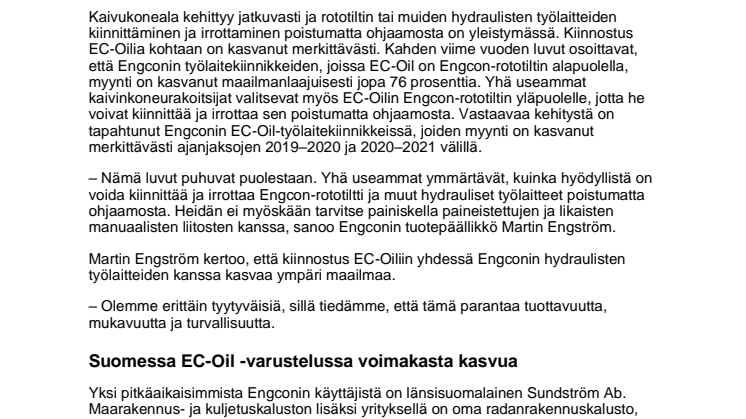 Kaivukoneala kehittyy jatkuvasti ja rototiltin tai muiden hydraulisten työlaitteiden kiinnittäminen ja irrottaminen poistumatta ohjaamosta on yleistymässä. Kiinnostus EC-Oilia kohtaan on kasvanut merkittävästi. Kahden viime vuoden luvut osoittavat, että Engconin työlaitekiinnikkeiden, joissa EC-Oil on Engcon-rototiltin alapuolella, myynti on kasvanut maailmanlaajuisesti jopa 76 prosenttia. Yhä useammat kaivinkoneurakoitsijat valitsevat myös EC-Oilin Engcon-rototiltin yläpuolelle, jotta he voivat kiinnittää ja irrottaa sen poistumatta ohjaamosta. Vastaavaa kehitystä on tapahtunut Engconin EC-Oil-työlaitekiinnikkeissä, joiden myynti on kasvanut merkittävästi ajanjaksojen 2019–2020 ja 2020–2021 välillä.
