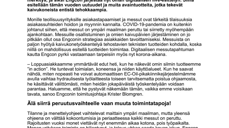 Monille teollisuusyrityksille asiakastapaamiset ja messut ovat tärkeitä tilaisuuksia asiakassuhteiden hoidon ja myynnin kannalta. COVID-19-pandemia on kuitenkin johtanut siihen, että messut on ympäri maailman peruttu tai siirretty myöhempään ajankohtaan. Messuille osallistuminen ja omien kaivupäivien järjestäminen on jo pitkään ollut osa Engconin strategiaa asiakkaiden tavoittamiseksi. Messuista on paljon hyötyä kaivukonetyöskentelyä tehostavien teknisten tuotteiden kohdalla, koska niillä on mahdollisuus esitellä tuotteiden toimintaa. Digitaalisen messutapahtuman kautta Engcon pyrkii vastaamaan tarpeisiin myös nyt korona-aikana.