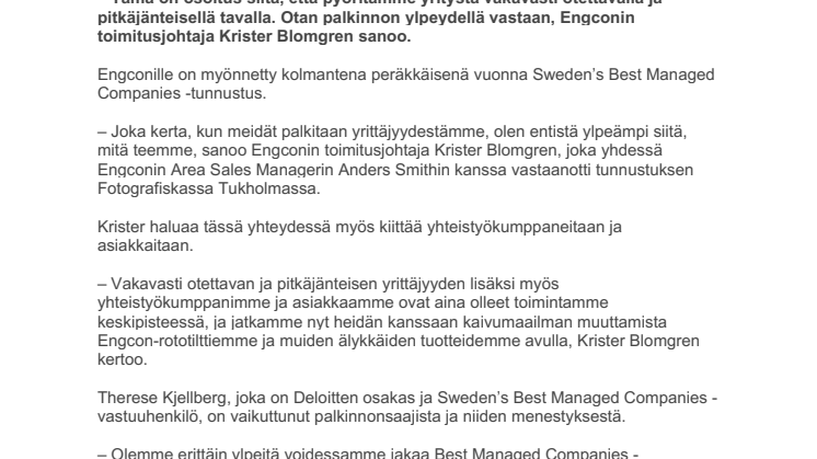 Engcon on saanut kolmantena vuonna peräkkäin Sweden’s Best Managed Companies -tunnustuksen, jonka Deloitte myöntää yhteistyössä Nasdaqin kanssa.