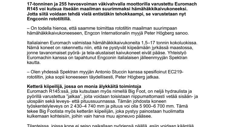 17-tonninen ja 255 hevosvoiman väkivahvalla moottorilla varustettu Euromach R145 voi kutsua itseään maailman suurimmaksi hämähäkkikaivukoneeksi. Jotta siitä voidaan tehdä vielä entistäkin tehokkaampi, se varustetaan nyt Engconin rototiltillä.