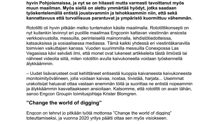 – Uudet lisävarusteet ovat kehittäneet entisestä kuoppia kaivaneesta kaivukoneesta monitoimityövälineen, jolla voidaan kaivaa, nostaa, tiivistää, harjata... Useimmat urakoitsijat haluavat ottaa vastaan enemmän töitä ja suorittaa ne entistä nopeammin ja älykkäämmin kasvattaakseen ansioitaan. Katsomme, että rototiltti on avain tähän, sanoo Engcon Groupin toimitusjohtaja Krister Blomgren.