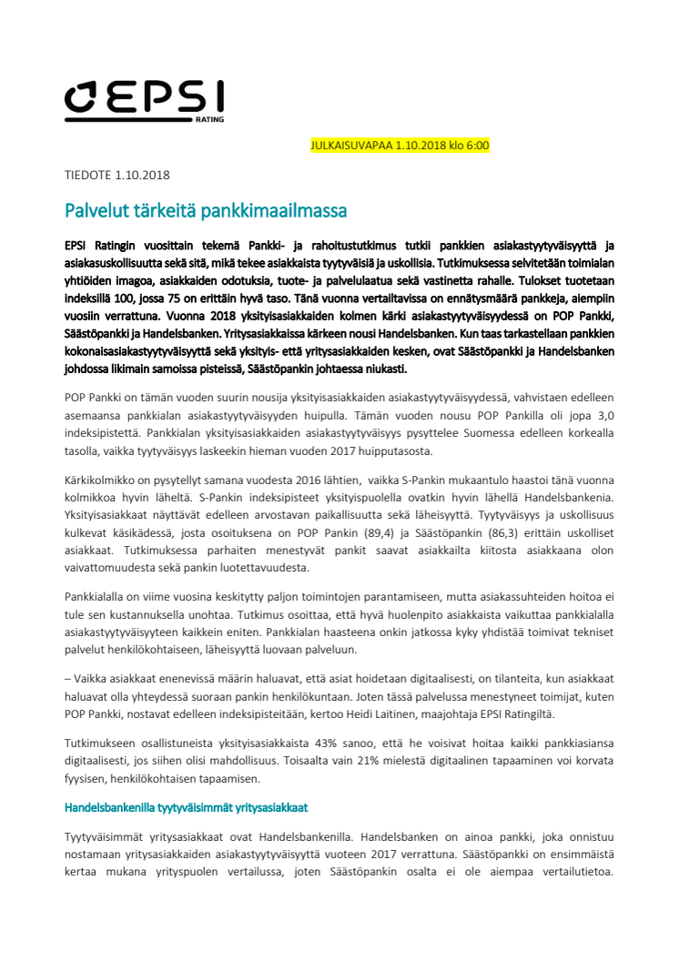 EPSI Ratingin vuosittain tekemä Pankki- ja rahoitustutkimus tutkii pankkien asiakastyytyväisyyttä ja asiakasuskollisuutta sekä sitä, mikä tekee asiakkaista tyytyväisiä ja uskollisia. Vuonna 2018 yksityisasiakkaiden kolmen kärki asiakastyytyväisyydessä on POP Pankki, Säästöpankki ja Handelsbanken. Yritysasiakkaissa kärkeen nousi Handelsbanken.
