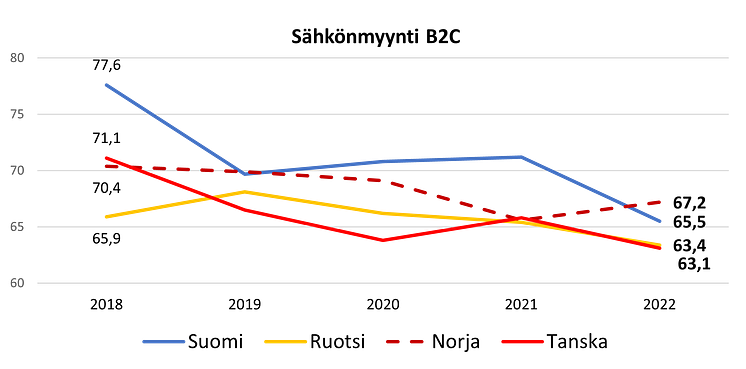 Sähkönmyynnin asiakastyytyväisyys Pohjoismaissa 2018-2022