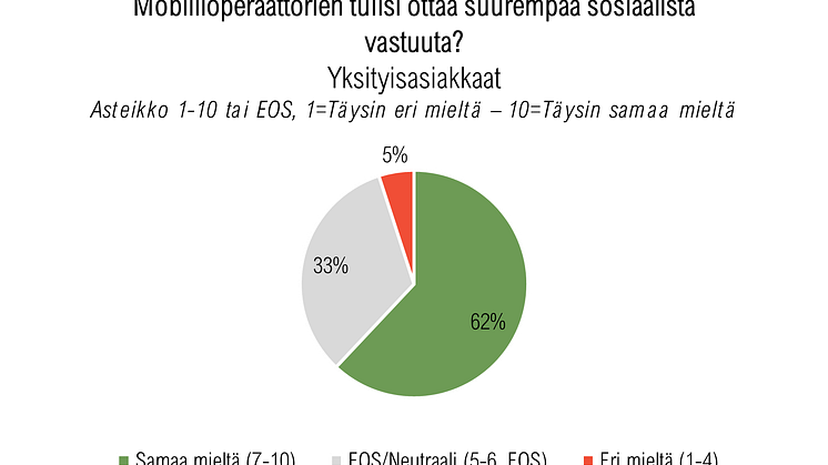 Mobiiliopeaattoreiden odotetaan kantavan kortensa kekoon ja toimivan entistä vastuullisemmin tulevaisuudessa. 62% yksityisasiakkaista ja 63% yritysasiakkaista oli samaa mieltä tai täysin samaa mieltä väittämän kanssa, että alan yritysten tulisi ottaa enemmän sosiaalista vastuuta. Väittämän suhteen eri mieltä olevien osuus puolestaan oli yksityisasiakkaiden parissa vain 5% ja yritysasiakkaiden keskuudessa 9%.