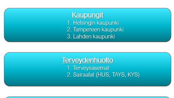 Tutkimuksessa kartoitettiin avoimen kysymyksen avulla julkisen sektorin toimijoita, jotka mielletään kestävän kehityksen työssään erityisen hyväksi. Vaikka kaikki toimijat eivät välttämättä lukeudu täysin julkisen sektorin toimintaan, voi yritystoiminta olla keskeisesti yhteydessä esimerkiksi kunnan toimintaan. Olemme koonneet alle esimerkkejä kolmesta tyypillisimmin vastauksissa esiintyneistä toimijoista: