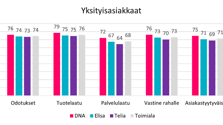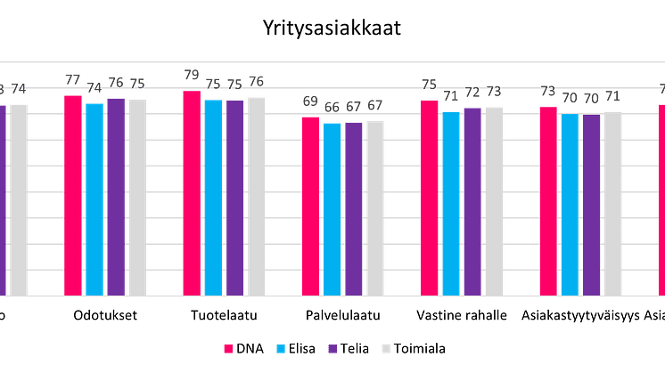 DNA vie kärkipaikan sekä yksityis- että yritysasiakkaiden parissa. Molemmissa asiakassegmenteissä toiseksi ja samalla lähimmäksi toimialan keskitasoa sijoittuu Elisa, ja vertailun viimeiseksi jää puolestaan Telia. ”Yksityisasiakkaiden arvioissa DNA ottaa melko selvän voiton ja hipoo erittäin tyytyväisten asiakkaiden rajaa”, nostaa Laitinen, ”Toisaalta on syytä huomioida operaattorien välisten tyytyväisyyserojen olevan yritysasiakkaiden parissa vähäisempiä.”
