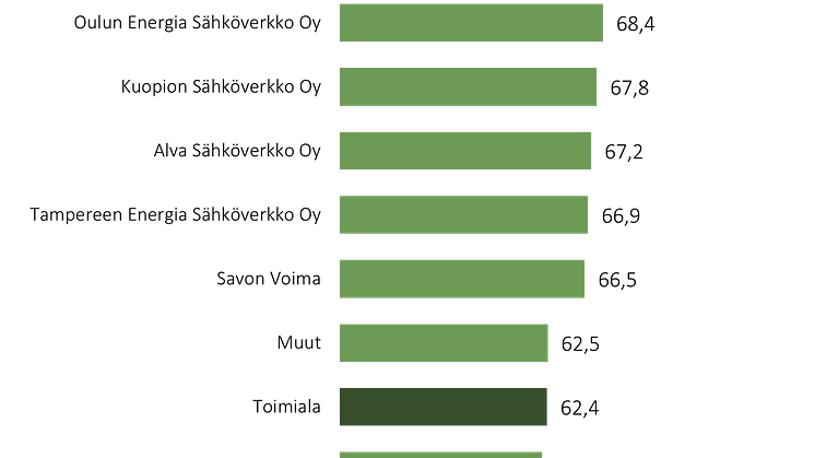 Kuopion Sähköverkko voittaa yksityisasiakkaiden rankingin kokonaispistemäärällä 67,3, mikä osoittaa yrityksen menestyvän varsin hyvin asiakkaiden odotusten täyttämisessä kestävän kehityksen osalta. Toiseksi sijoittuu Vantaan Energia Sähköverkot(66,4), ja kolmanneksi Helen Sähköverkko (65,6). Näitä yhtiöitä yhdistää kyky vastata asiakkaiden kestävyyteen liittyviin odotuksiin, ja ne ovat saaneet kiitosta erityisesti vastuullisuuteen panostamisesta. Toisessa ääripäässä Carunasijoittuu rankingin alimmaksi 36,2 pisteellä, jääden poikkeuksellisen paljon toimialan keskiarvosta. Tämä heikko tulos viittaa siihen, että yhtiö ei onnistu vastaamaan asiakkaidensa odotuksiin vastuullisuuden ja kestävän kehityksen osalta. Caruna Espoo saa hieman paremman arvosanan (50,0), mutta jää silti kauas kärkiyhtiöistä.