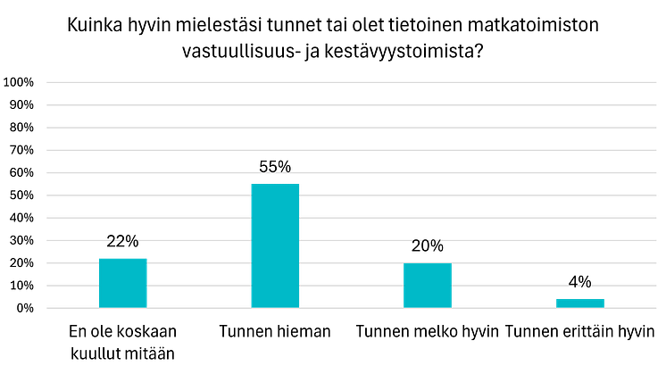 Samaan aikaan tutkimus paljastaa, että valtaosa matkatoimistoista ei onnistu vielä viestimään vastuullisuustyötään aivan riittävästi. Asiakas ei usein tiedä mihin yritys on sitoutunut, eikä siten sitoudu siihen itse. 77% asiakkaista esimerkiksi ilmoittaa, että tuntee matkatoimiston vastuullisuustoimia vain hieman tai ole koskaan kuullut mitään. Samaan aikaan tosin 43% ilmoittaa matkatoimiston viestivän toiminnastaan mielestään hyvin tai erittäin hyvin. "Asiakkaiden herkkyydessä teeman suhteen on myös eroja, toisille riittää vähempi ja toiset vaativat enemmän", Laitinen muistuttaa.