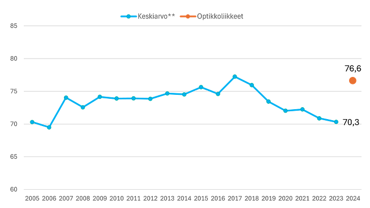 ”Alan tyytyväisyys on myös korkeampaa kuin muilla toimialoilla Suomessa yleisesti tai historiallisesti”, taustoittaa Laitinen. ”EPSI on mitannut asiakastyytyväisyyslukemia Suomessa vuodesta 1999 lähtien, ja näin korkeat pisteet ovat kaiken kaikkiaan harvinaisia. Esimerkiksi vuosina 2021-2023 ei mitattu yhdeltäkään toimialalta näitä korkeampia lukemia. Tämä merkittävä saavutus korostaa suomalaisten optikkoliikkeiden sitoutumista huippuosaamiseen ja yksilölliseen palveluun, ja onkin samalla tunnustus kovasta työstä ja omistautumisesta”, Laitinen analysoi.