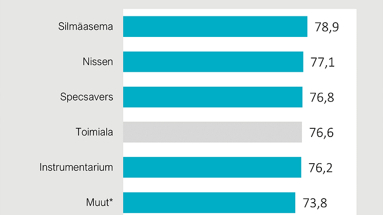 Tulokset ovat erittäin hyviä laajemmassakin tarkastelussa. Rankingissa Silmäasemaa seuraavat Nissen, Specsavers ja Instrumentarium sijoittuvat vain 0,9 indeksipisteen sisälle toisistaan, ja myös näistä kukin ylittää erittäin tyytyväisten asiakkaiden rajan (75). Toimijoiden asiakastyytyväisyyslukemien virhemarginaalit ovat Silmäasemalla ja Specsaversilla 2,2, Nissenillä 2,3, Instrumentariumilla 2,6, ja muista kuin rankingiin eroteltavista toimijoista koostuvalla Muut-ryhmällä 2,1. Muut-ryhmä mittauttaa sekin keskimäärin tyytyväisistä asiakkaista kertovat lukemat, joskin ryhmän sisällä havaintaan myös suuntaa-antavia eroja. ”Ryhmä koostuu suurimmaksi osaksi Synsamista ja Fenno Optiikasta, mutta myös Keopsista sekä yksittäisiä liikkeitä ylläpitävistä toimijoista”, Laitinen taustoittaa.
