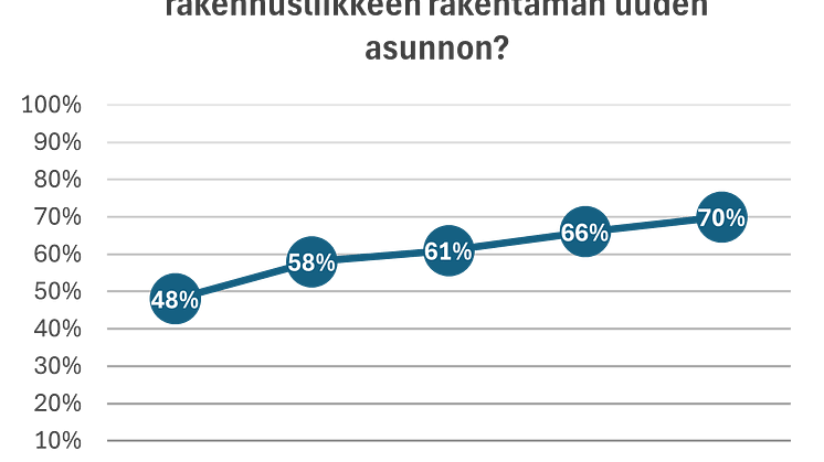 Yleisväestön edustajista 70% ilmoittaa, että voisi ajatella ostavansa tulevaisuudessa rakennus-liikkeen rakentaman uuden asunnon. Osuus on ollut kasvussa jo useita vuosia. ”Uudisasunnon hankkimisesta kiinnostuneiden kuluttajien määrä on kasvanut samaan aikaan kun luottamus alaa kohtaan on noussut. Kun samalla uudisasuntoja valmistuukin totuttua vähemmän, kuluttajien tunnelmaa voisi luonnehtia odottavaksi”, Laitinen muotoilee.