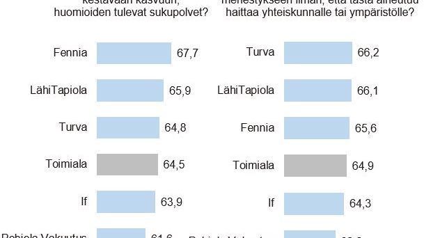Fennian arvioidaan yksityisasiakkaiden parissa esimerkiksi parhaiten investoivan tulevat sukupolvet huomioivaan kestävään kasvuun, Turvan puolestaan mielletään vahvimmin pyrkivän taloudelliseen menestykseen ilman yhteiskunnalle tai ympäristölle aiheutuvaa haittaa.